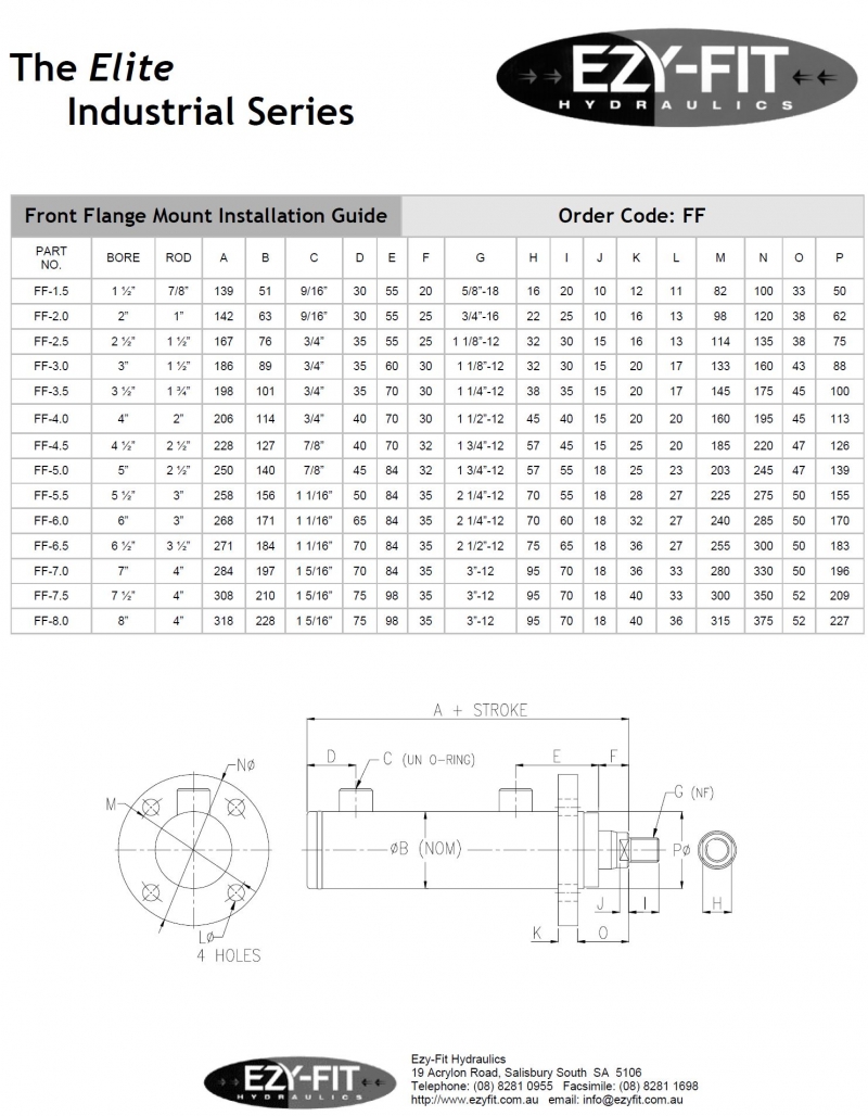 Used where the shortest possible column length is required and a front mounting plate is available. Good push and pull characteristics but care must be taken to ensure correct alignment of piston rod to workload centreline. Flange profile can be square, rectangular, round or even an irregular shape if required.